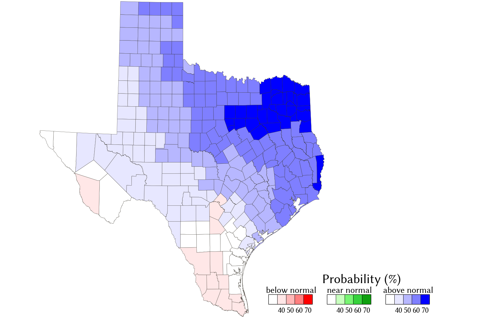 The May‒July seasonal rainfall forecast is an experimental forecast. It is primarily meant to be an information source to aid the implementation of drought contingency and emergency management plans. The TWDB provides information via this web site as a public service. Neither the State of Texas nor the TWDB assumes any legal liability or responsibility or makes any guarantees or warranties as to the accuracy, completeness, or suitability of the information for any particular purpose.