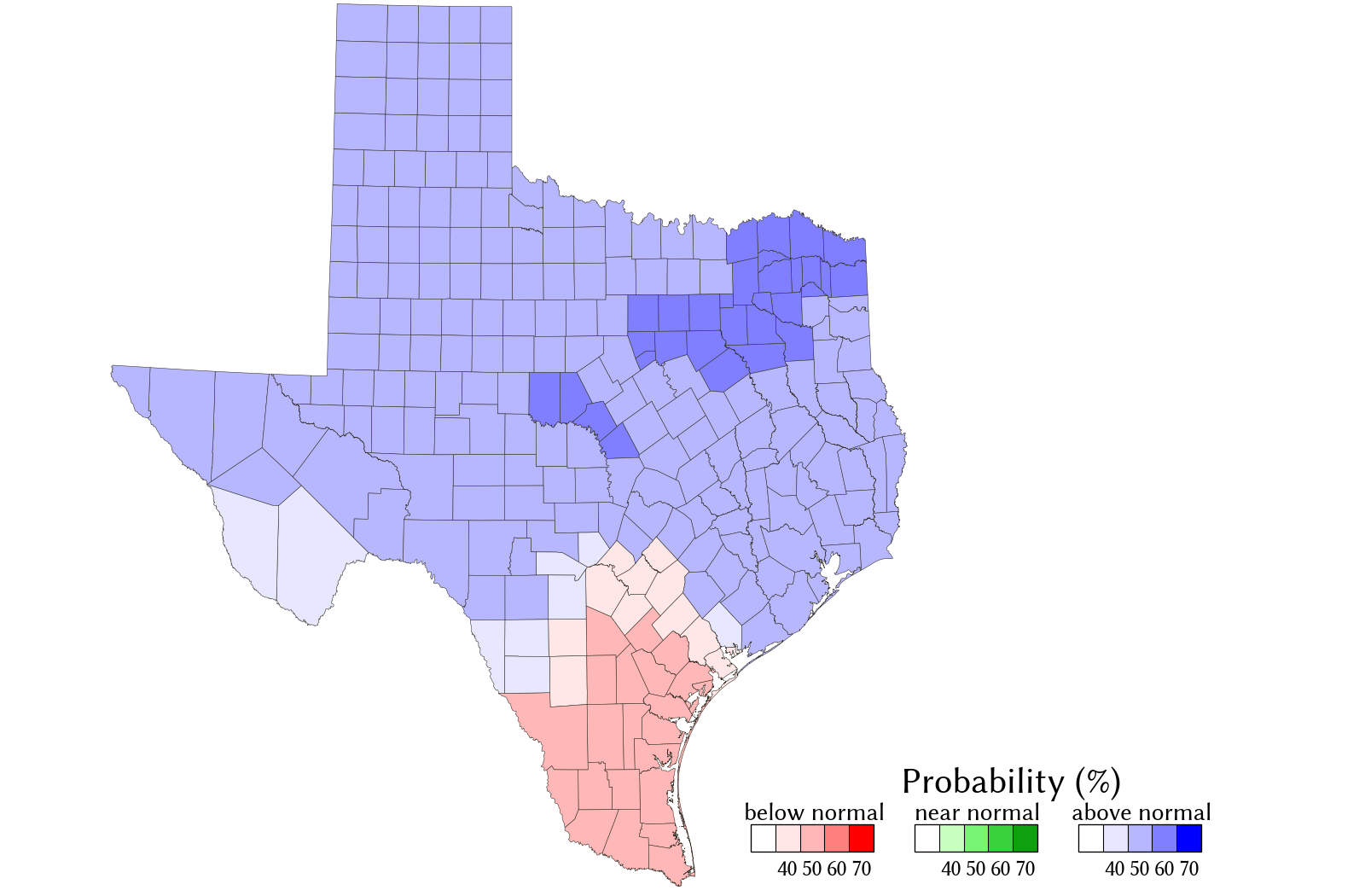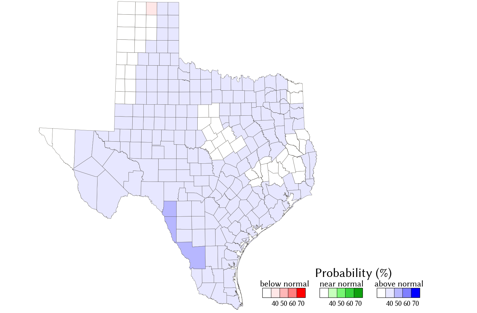 The May‒July seasonal rainfall forecast is an experimental forecast. It is primarily meant to be an information source to aid the implementation of drought contingency and emergency management plans. The TWDB provides information via this web site as a public service. Neither the State of Texas nor the TWDB assumes any legal liability or responsibility or makes any guarantees or warranties as to the accuracy, completeness, or suitability of the information for any particular purpose.